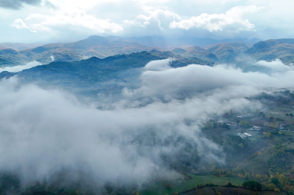 Yeşilin ve gri tonlarının iç içe geçtiği manzara, eşsiz bir görsel şölen oluştururken, bölgeye hakim atmosfer dron kamerasıyla ölümsüzleştirildi.