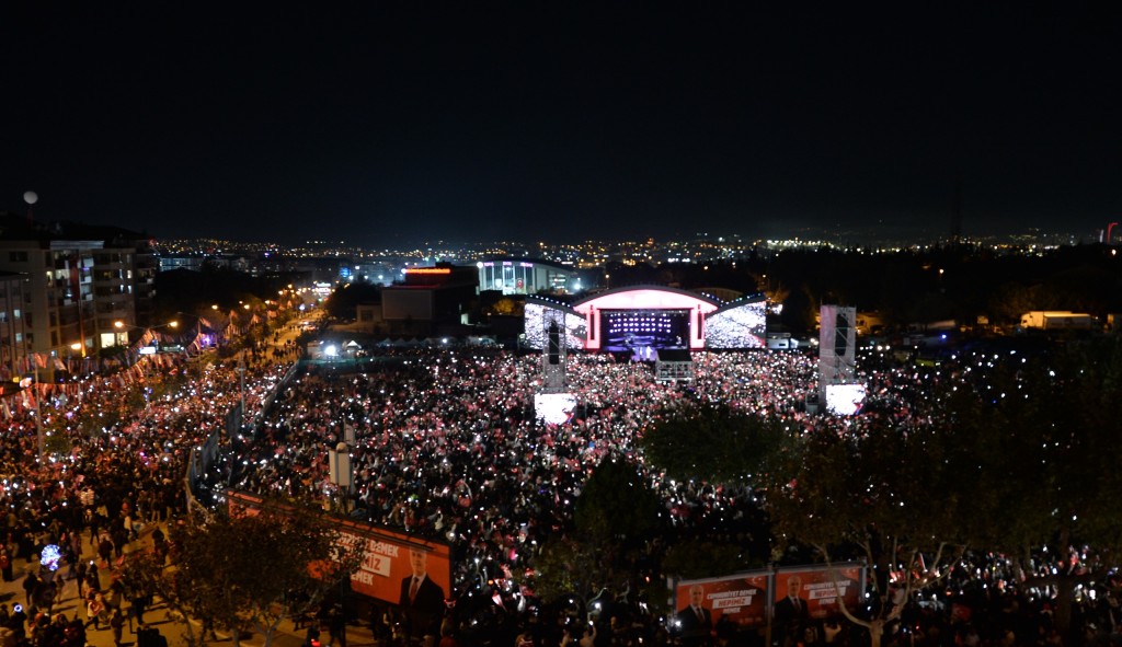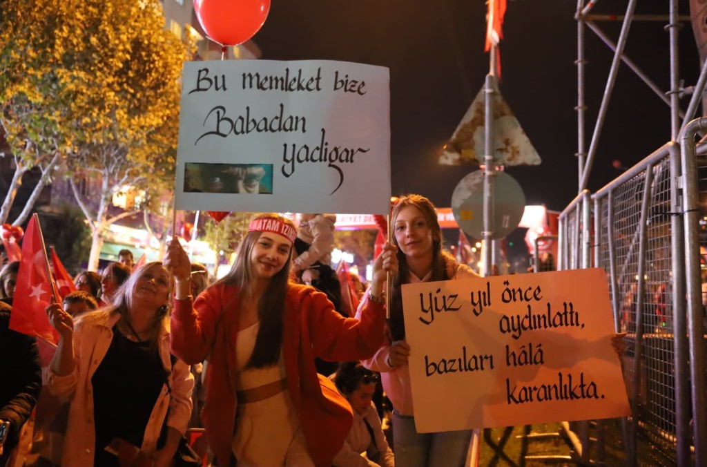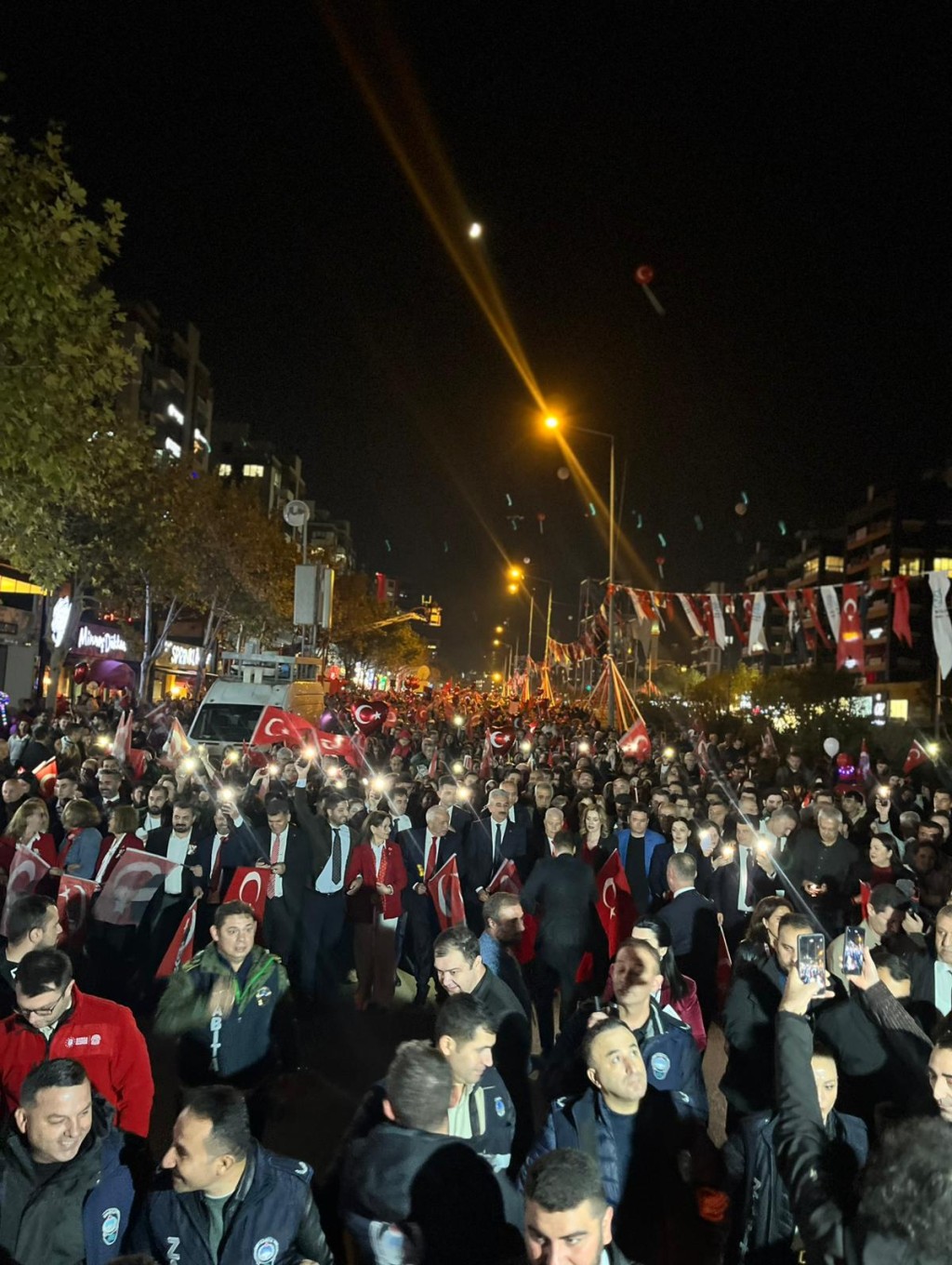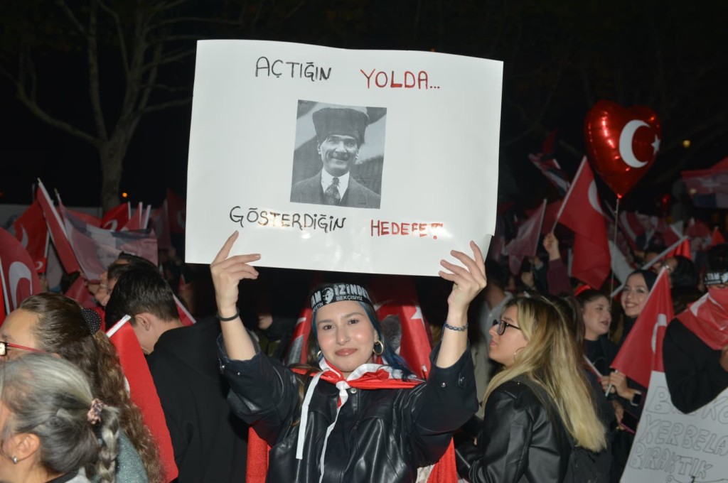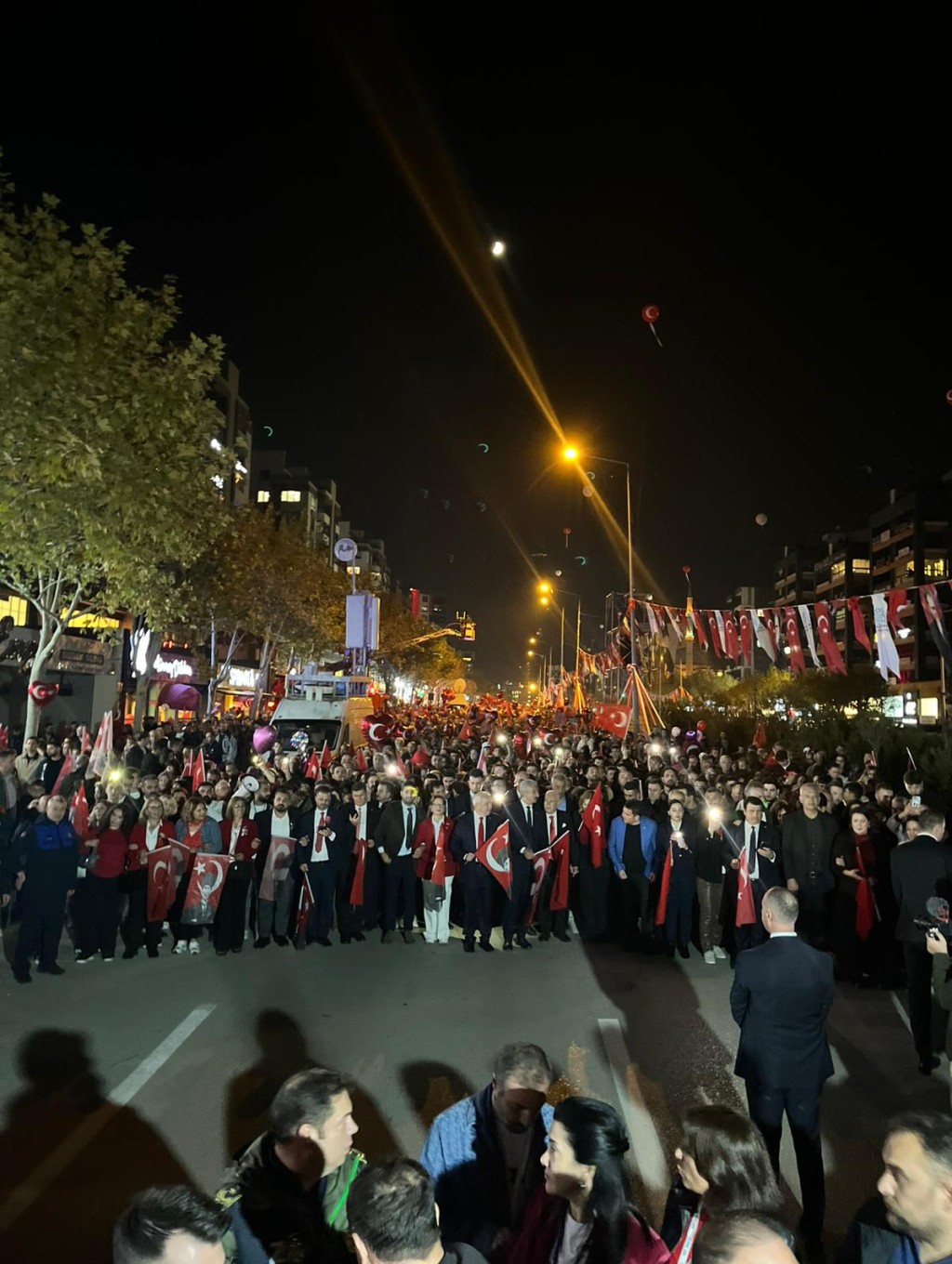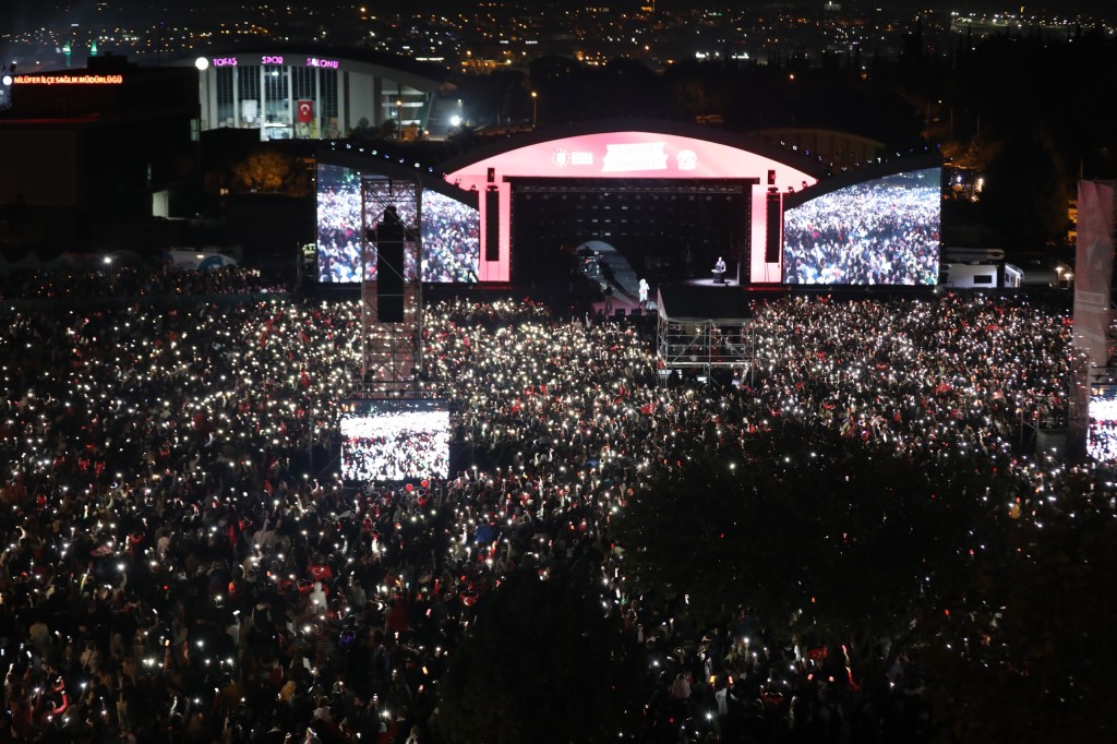 Bursa Büyükşehir Belediyesi ve Nilüfer Belediyesi tarafından düzenlenen "Cumhuriyet Yürüyüşü"ne katılan on binlerce Bursalı, ellerindeki Türk Bayrakları ve Atatürk posterleriyle Cumhuriyet Bayramı'nın 102. yılını büyük bir coşkuyla kutladı. Bursa'nın tek yürek olduğu yürüyüşün ardından sanatçı Edis sahne alarak, vatandaşlara muhteşem bir bayram yaşattı. Onbinlerce Bursalının cep telefonlarının ışıklarıyla oluşturduğu renkli görüntüler ise dronla kaydedildi.