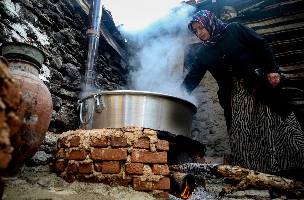 Ekipman almak için ORKÖY projesi kapsamında yüzde 20'si hibe geri kalanı ise faizsiz ödemeli 1 milyon 610 bin lira destek verilen kadınlar, eşlerinin ormandan topladığı kozalakları kazanlarda kaynatıp özüyle pekmez yapıyor.