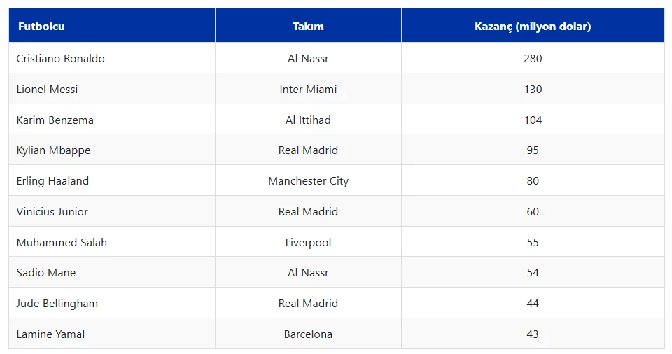 Erling Haaland (Manchester City)Norveçli yıldız Erling Haaland, saha içi ve dışında elde ettiği gelirle yılın en fazla kazanan 5. futbolcusu oldu.Her geçen yıl sponsorluk anlaşmalarını büyüten 25 yaşındaki oyuncu, yeşil sahalardaki başarısını saha dışına da taşıdı.Manchester City'den 60 milyon dolar alan Haaland, saha dışından da 20 milyonluk geliriyle 2025 yılında 80 milyon dolar kazanca ulaştı.
