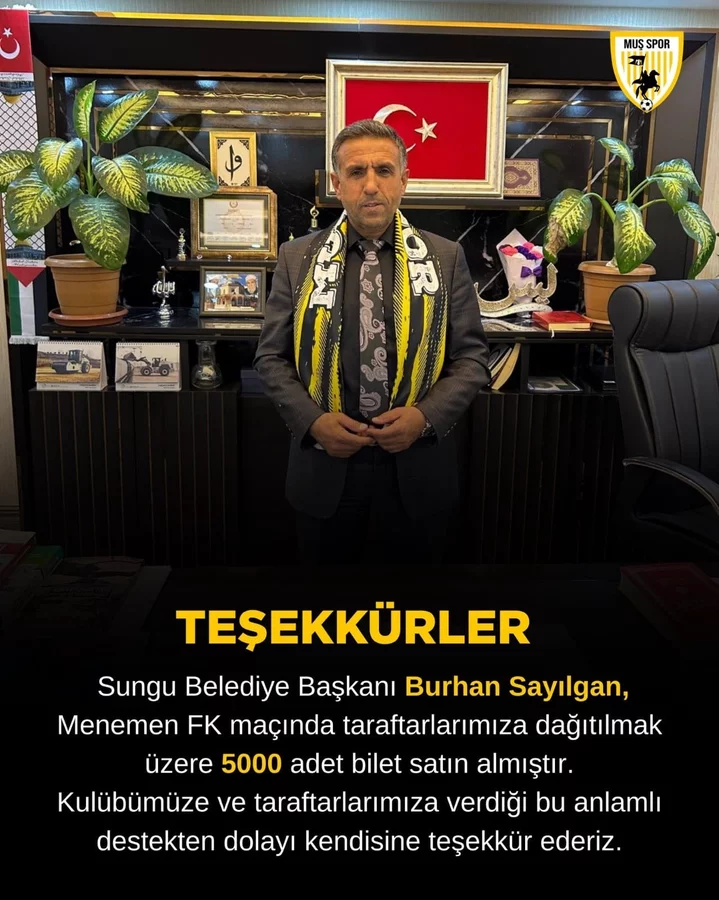 Muş Spor'un açıklamasında, "Sungu Belediye Başkanı Burhan Sayılgan, Menemen FK maçında taraftarlarımıza dağıtılmak üzere 5 bin adet bilet satın almıştır. Kulübümüze ve taraftarlarımıza verdiği bu anlamlı destekten dolayı kendisine teşekkür ederiz" ifadelerine yer verildi.