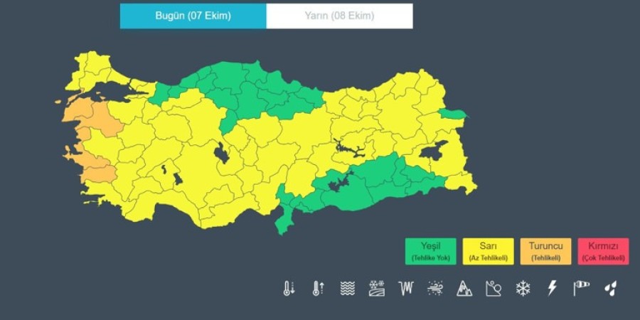 Kuvvetli yağış beklenen; Aydın, Balıkesir, Çanakkale ve İzmir için "turuncu", kuvvetli yağış beklenen; Afyonkarahisar, Ankara, Bilecik, Bolu, Burdur, Bursa, Denizli, Edirne, Eskişehir, Isparta, İstanbul, Kırklareli, Kocaeli, Kütahya, Manisa, Muğla, Tekirdağ, Uşak ve Yalova, kuvvetli yağış ve rüzgar beklenen; Antalya, Konya, kuvvetli rüzgar beklenen Adana, Ağrı, Artvin, Bingöl, Bitlis, Elazığ, Erzincan, Erzurum, Giresun, Gümüşhane, Hakkari, Mersin, Kars, Kayseri, Kırşehir, Malatya, Kahramanmaraş, Muş, Nevşehir, Niğde, Rize, Sivas, Trabzon, Tunceli, Van, Yozgat, Aksaray, Bayburt, Karaman ve Ardahan için "sarı" kodlu uyarıda bulunuldu.
