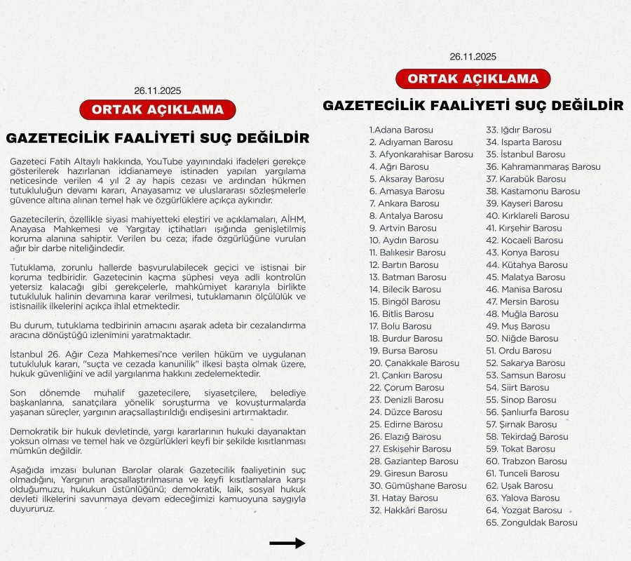 Aşağıda imzası bulunan Barolar olarak Gazetecilik faaliyetinin suç olmadığını, Yargının araçsallaştırılmasına ve keyfi kısıtlamalara karşı olduğumuzu, hukukun üstünlüğünü; demokratik, laik, sosyal hukuk devleti ilkelerini savunmaya devam edeceğimizi kamuoyuna saygıyla duyururuz."
