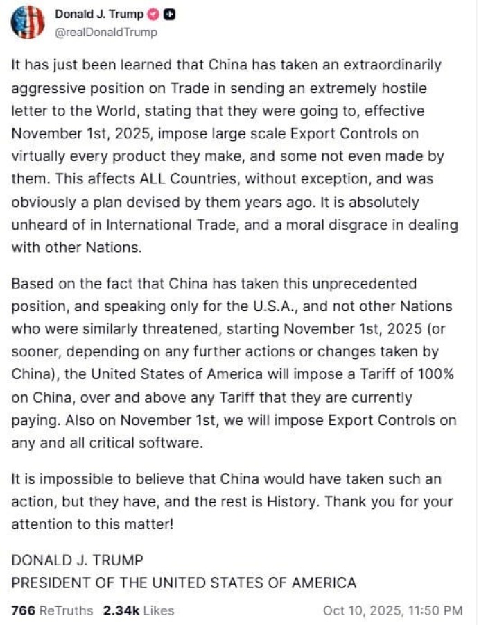 "Çin'in, dünyaya son derece düşmanca bir mektup göndererek ticaret konusunda olağanüstü agresif bir pozisyon aldığı ve 1 Kasım 2025 itibarıyla, neredeyse ürettikleri her ürüne -- hatta bazılarını kendileri üretmeseler bile -- geniş çaplı ihracat kontrolleri uygulayacaklarını bildirdiği yeni görüldü. Bu durum, istisnasız tüm ülkeleri etkiliyor ve açıkça yıllar önce planlanmış bir stratejinin ürünü. Uluslararası ticarette eşi benzeri görülmemiş bu adım, diğer uluslarla ilişkilerde ahlaki bir utanç vesilesidir.