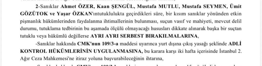 İstanbul 1. Ağır Ceza Mahkemesi tensip kararıyla, Esenyurt Belediye Başkanı Ahmet Özer hakkında tahliye kararı verildi.