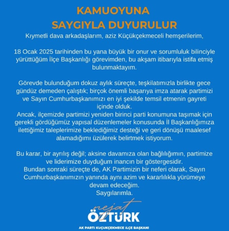 18 Ocak 2025 tarihinden bu yana büyük bir onur ve sorumluluk bilinciyle yürüttüğüm İlçe Başkanlığı görevimden, bu akşam itibarıyla istifa etmiş bulunmaktayım.