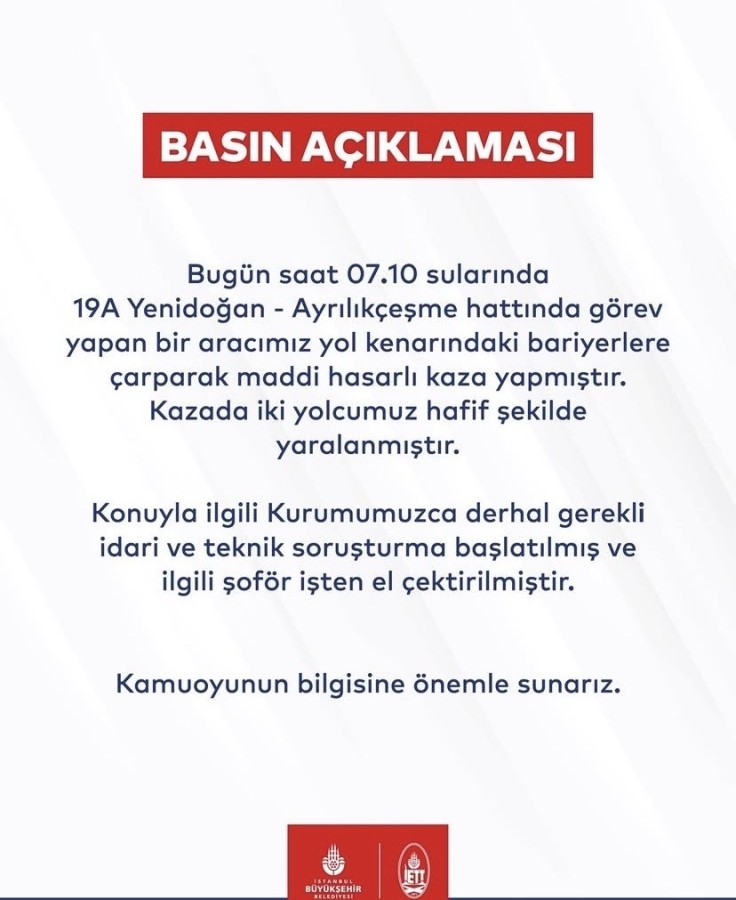 İETT'den yapılan açıklamada, "Bugün saat 07.10 sularında 19A Yenidoğan - Ayrılıkçeşme hattında görev yapan bir aracımız yol kenarındaki bariyerlere çarparak maddi hasarlı kaza yapmıştır. Kazada iki yolcumuz hafif şekilde yaralanmıştır. Konuyla ilgili Kurumumuzca derhal gerekli idari ve teknik soruşturma başlatılmış ve ilgili şoföre işten el çektirilmiştir" denildi.