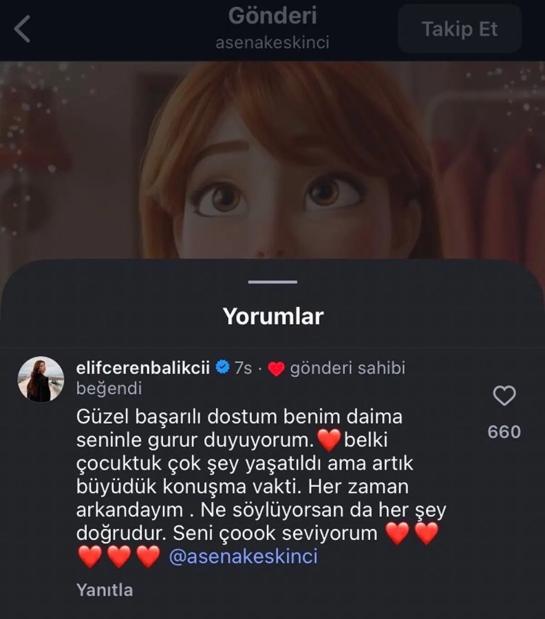 Dizide Pompirikya karakteriyle tanınan Elif Ceren Balıkçı, Asena Keskinci'ye sosyal medya üzerinden destek verdi. Balıkçı, Keskinci'nin paylaşımına yorum yaparak şu ifadeleri kullandı: