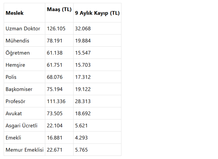 Temmuz ayında 43.726 TL olan en düşük memur maaşı da yüksek enflasyon karşısında büyük kayıp yaşadı. Sadece 9 ayda alım gücünden 12.843 TL eksildi. Uzman doktorlar, mühendisler, öğretmenler gibi farklı kamu çalışanlarının da maaşları benzer şekilde ciddi oranda eridi.