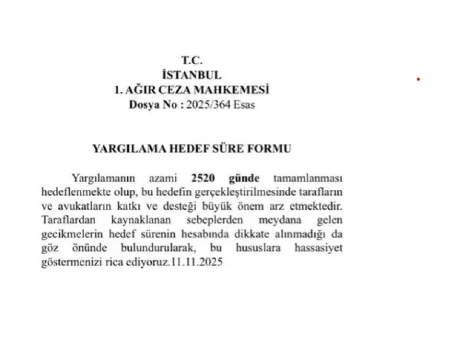 Öte yandan, davanın ek klasörlerine yansıyan bilgilere göre, yargılamanın azami 2520 günde tamamlanması hedefleniyor. Paylaşılan bilgilerde, 'taraflardan kaynaklanan sebeplerden meydana gelen gecikmeler'in hedef sürenin hesabında dikkate alınmaması gerektiği de belirtiliyor.