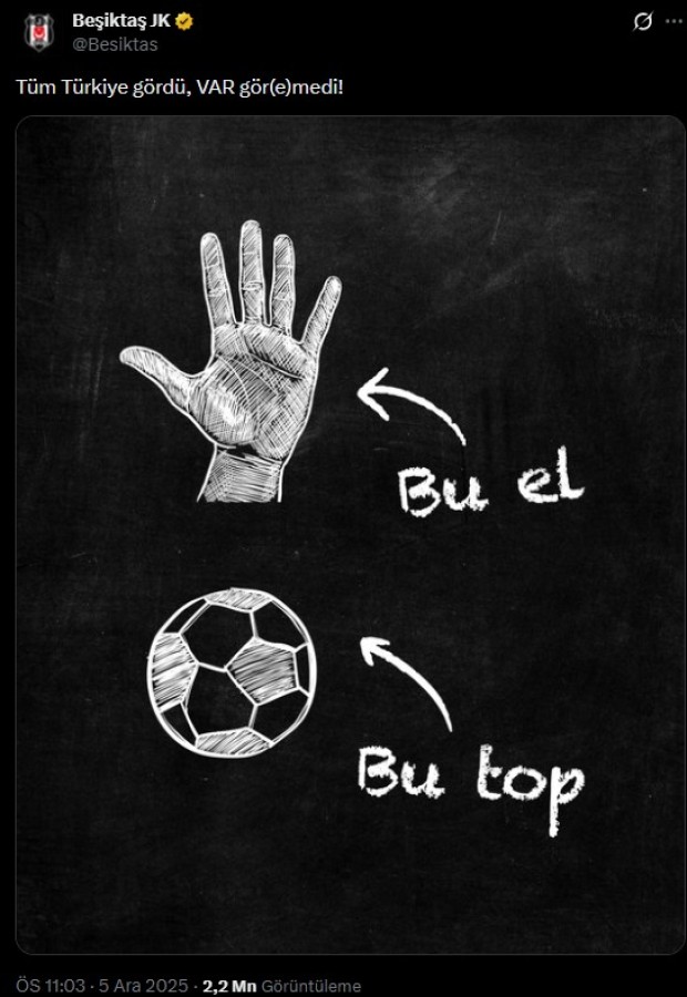 Tartışmalı pozisyon için Fenerbahçe'nin ardından tepki gösteren Beşiktaş, "Tüm Türkiye gördü, VAR gör(e)medi!" dedi.