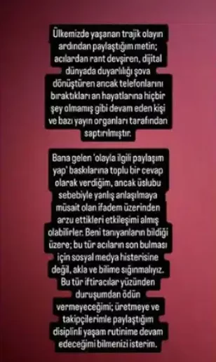 'Ülkemizde yaşanan trajik olayın ardından paylaştığım metin; acılardan rant devşiren, dijital dünyada duyarlılığı şova dönüştüren ancak telefonlarını bıraktıkları an hayatlarına hiçbir şey olmamış gibi devam eden kişi ve bazı yayın organları tarafından saptırılmıştır.