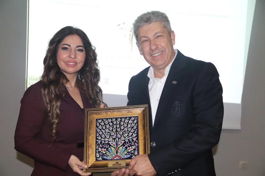 BUMİAD Başkanı Mustafa Gümüş, sunumun ardından, Fizik Tedavi ve Rehabilitasyon Uzmanı Dr. Elvan Kanat'a teşekkür plaketi takdim etti.