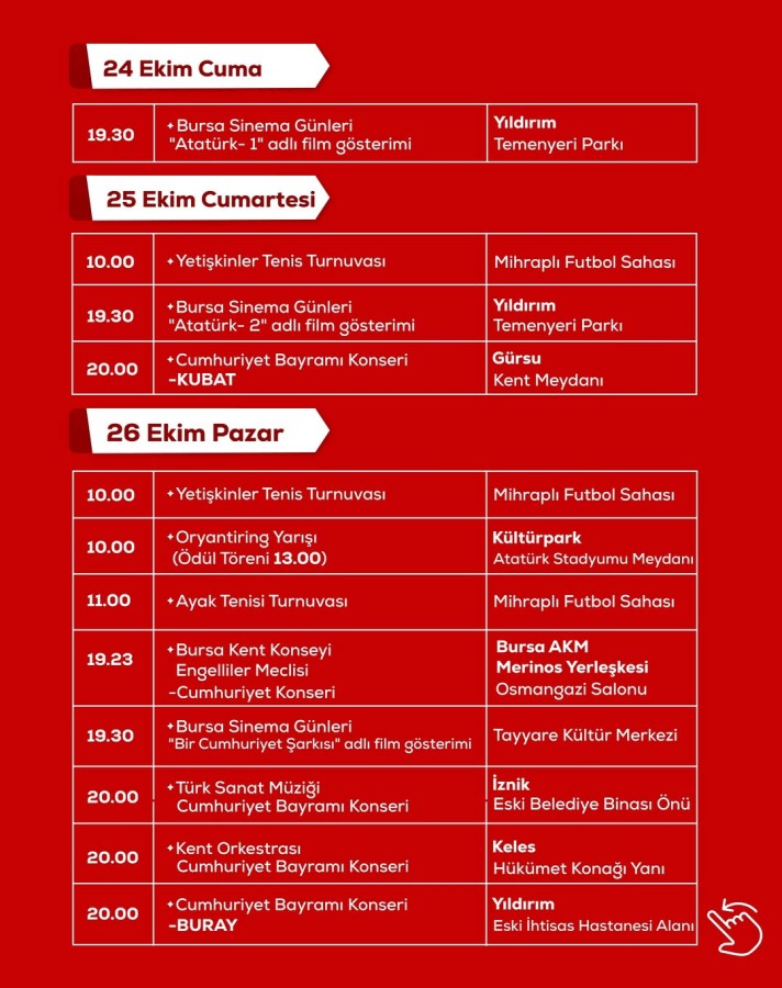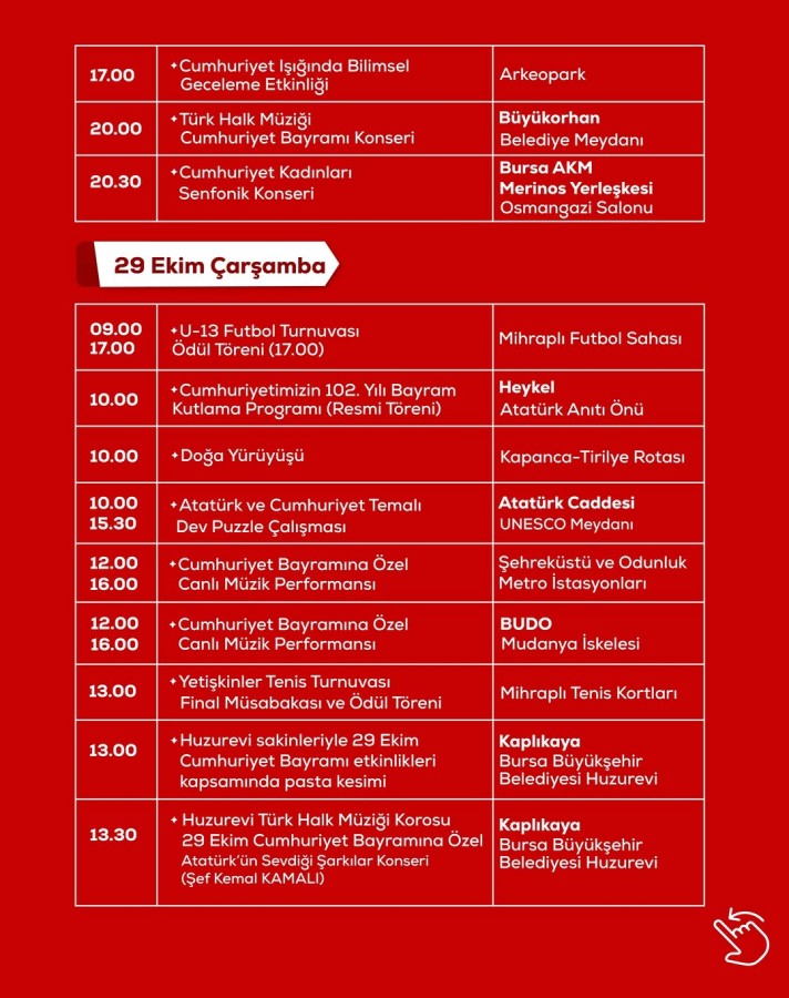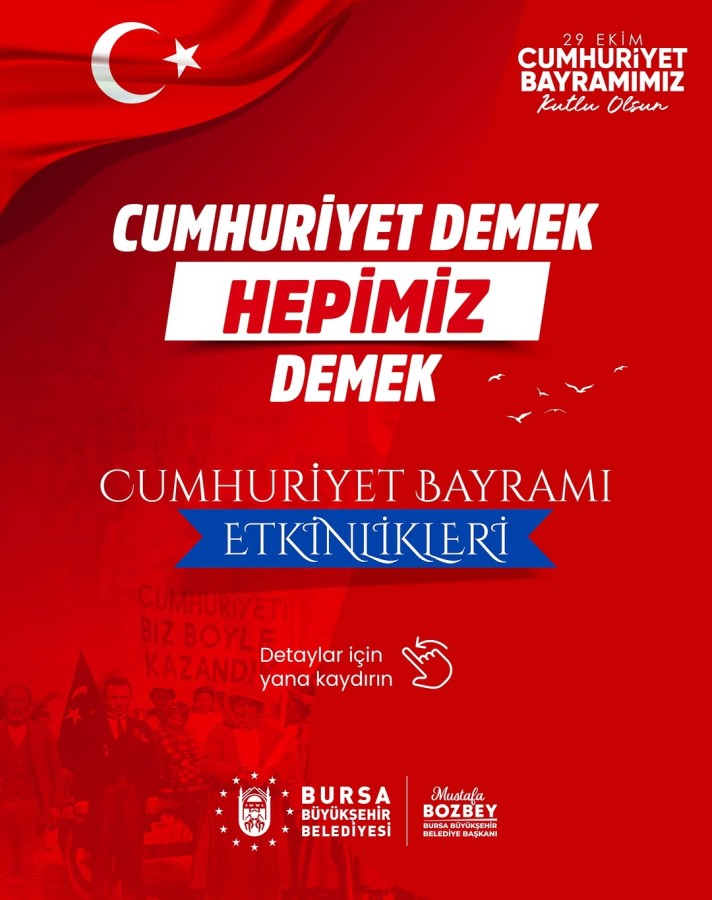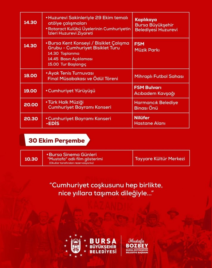 "Bursa Büyükşehir Belediyesi olarak, 29 Ekim Cumhuriyet Bayramımızı, bu yıl da adına yaraşır bir programla, Bursalı hemşehrilerimiz ile omuz omuza kutluyoruz.