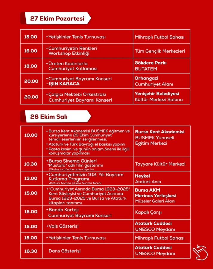 Kültürden sanata, spordan eğlenceye kadar pek çok alanda planlanan etkinliklerle Bursa, Cumhuriyet coşkusunu gün boyu yaşayacak.