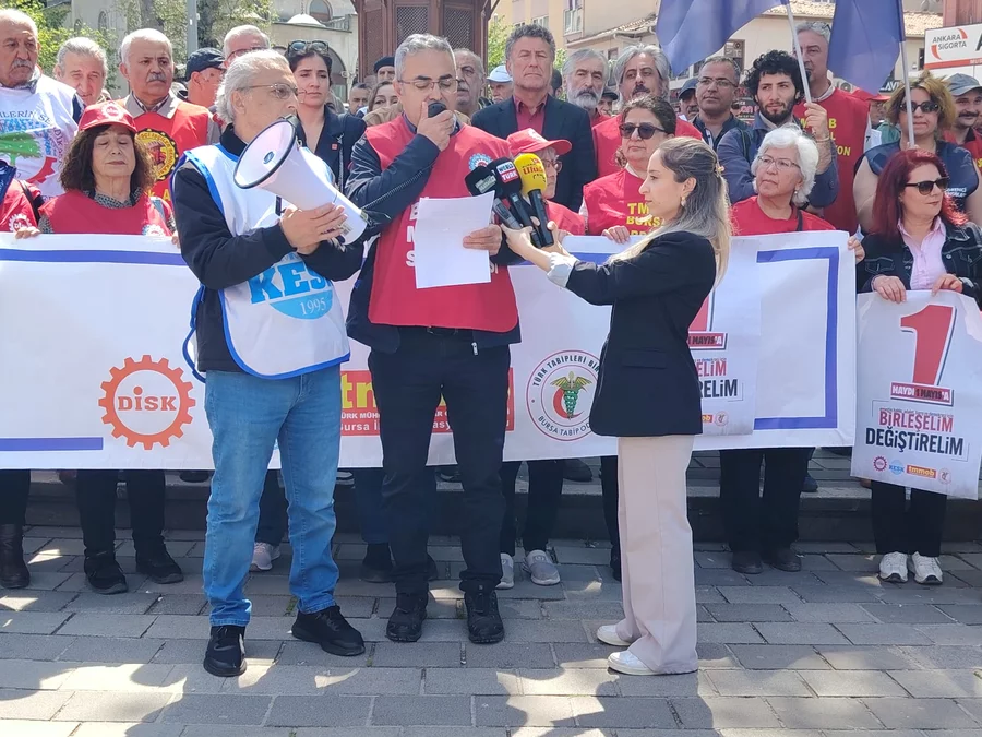 BURSA, 25 Nisan 2026 Cumartesi, 17:34Bursa'da DİSK, KESK, TMMOB ve TTB bileşenlerinin Şehreküstü Meydanı'nda yaptığı 1 Mayıs Birlik, Mücadele ve Dayanışma Günü kapsamındaki basın açıklamasını DİSK Marmara Bölge Temsilcisi Gökhan Aydın okudu. Yapılan açıklamada;