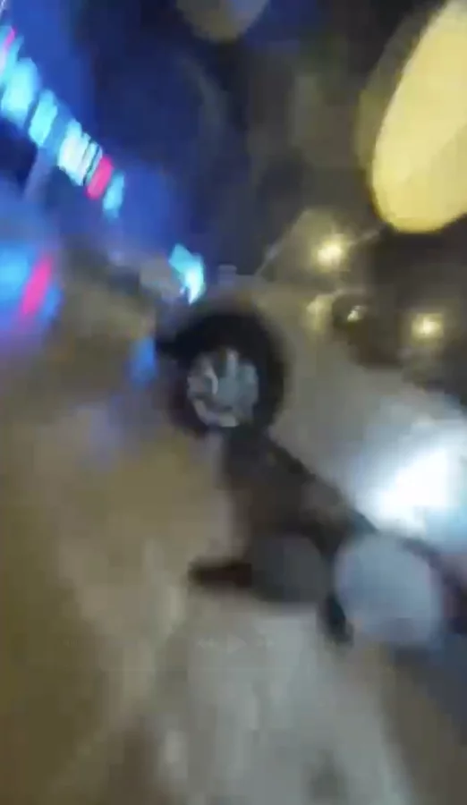 Kask kamerası görüntülerinde, cipin aniden yola çıkması, yağışın etkisiyle motosiklet sürücüsünün kontrolü kaybettiği ve panik anları yer alıyor.