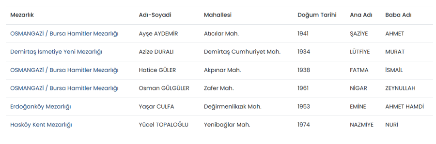 | Mezarlık | Adı-Soyadi | Mahallesi | Doğum Tarihi | Ana Adı | Baba Adı |