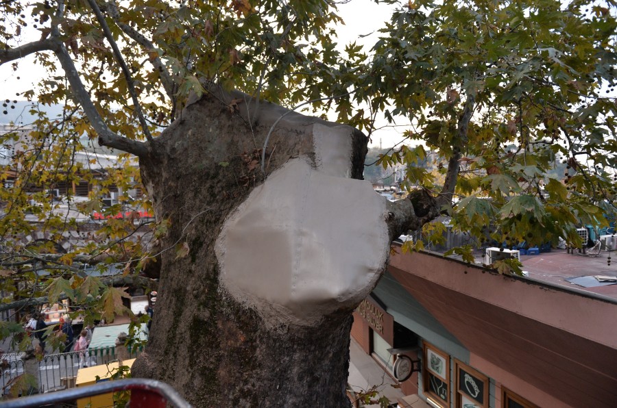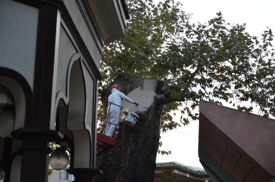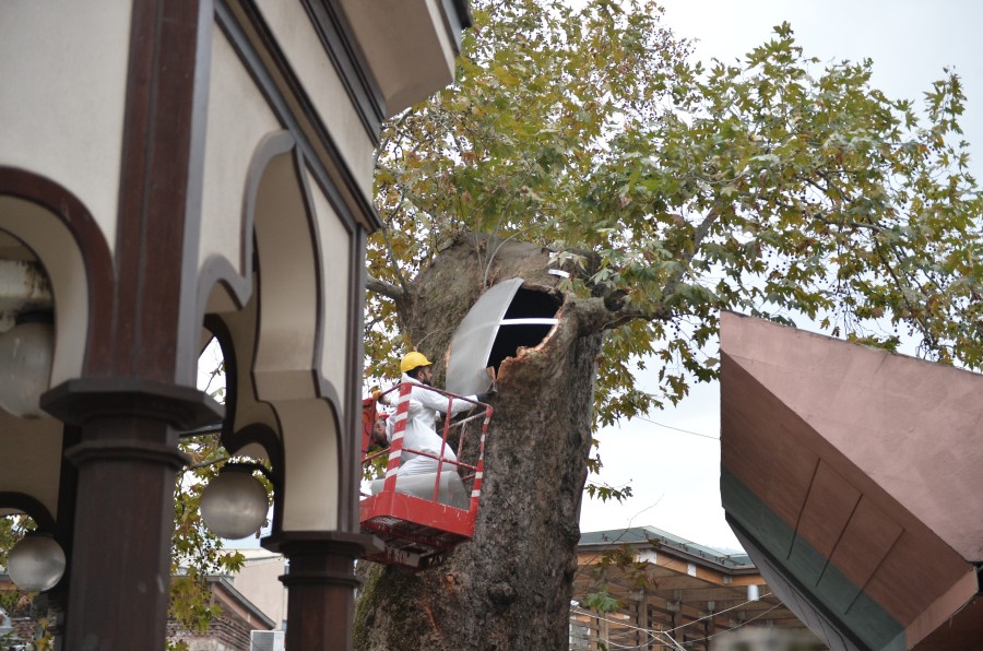 Park ve Bahçeler Dairesi Başkanlığı ekipleri tarafından yapılan incelemede, anıt ağacın açık yarasında çürümüş ve mantarlaşmış bölümler tespit edildi. Hızlı bir şekilde bakım ve restorasyon işlemlerine başlayan ekipler, özel ilaçlarla 'çürümeye yol açan' bakterileri temizledi. Ağacın iskeletine teller aracılığıyla destek uygulanırken, son aşamada özel yalıtım malzemesi kullanılarak ağacın açık yarası kapatıldı. Tedavi gören kısım boyanarak çınar ağacının formu yeniden düzenlendi.