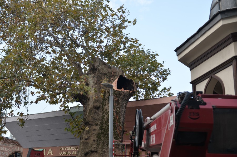 Ağacın gövdesiyle şadırvan arasında sıkışan dal, belediye ekiplerinin çalışmasıyla bulunduğu yerden kaldırıldı. Büyükşehir Belediyesi, Bursa için kadim medeniyetin sembolü olan asırlık çınarı tekrar geleceğe taşımak için zaman kaybetmeden harekete geçti.