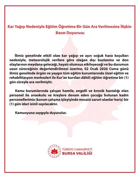 Valilikten yapılan açıklamada, meteorolojik verilere göre olağan dışı buzlanma ve don olaylarının beklendiği, bu durumun ulaşımda ve günlük yaşamda olumsuzluklara yol açabileceği belirtildi. Açıklamada, söz konusu riskler göz önünde bulundurularak 2 Ocak 2026 Cuma günü Bursa genelinde örgün ve yaygın eğitim kurumlarında eğitime bir gün süreyle ara verildiği ifade edildi.