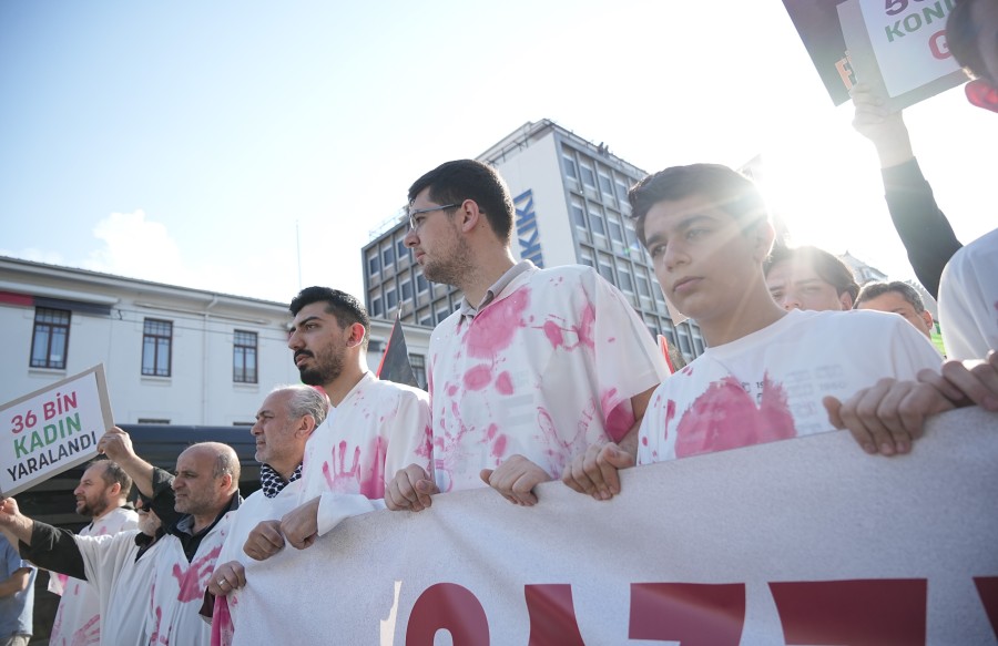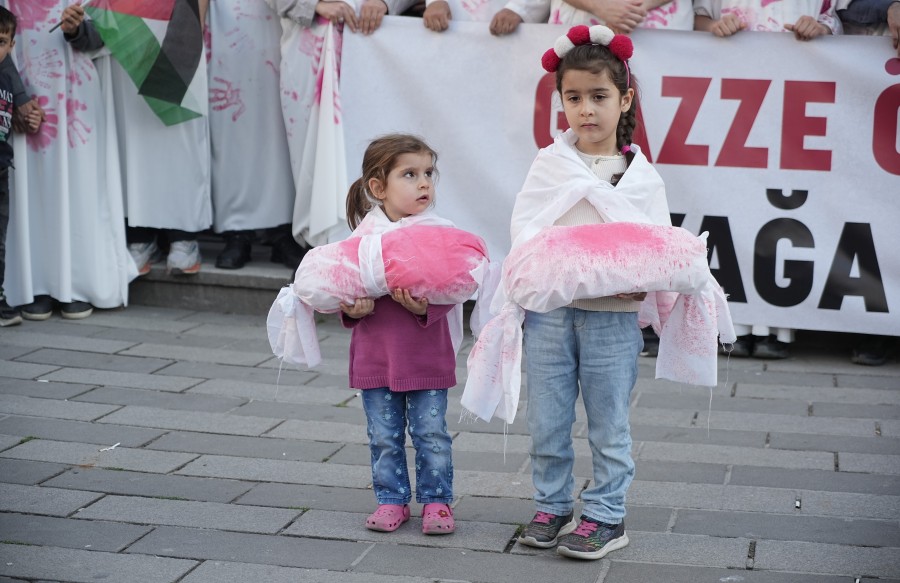 Üzerlerine kanlı kefen giyen vatandaşlar, 'Gazze ölüyor ayağa kalk' yazılı pankartlar taşıdı.