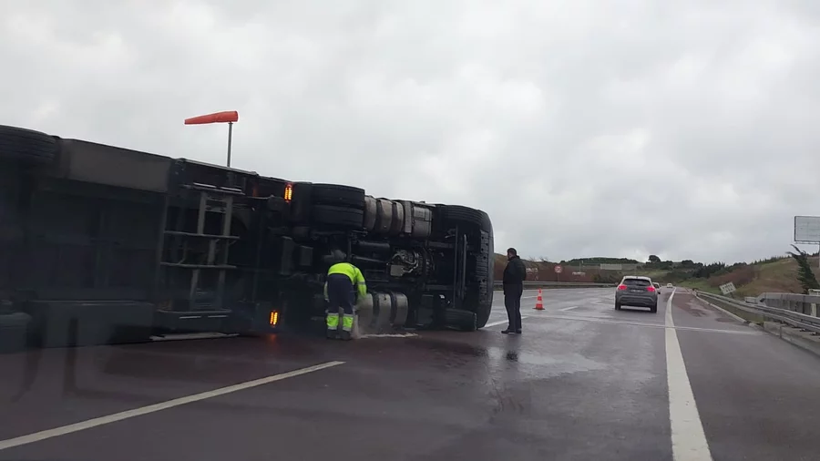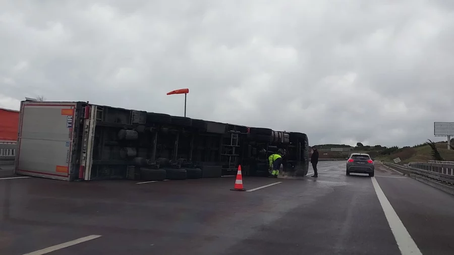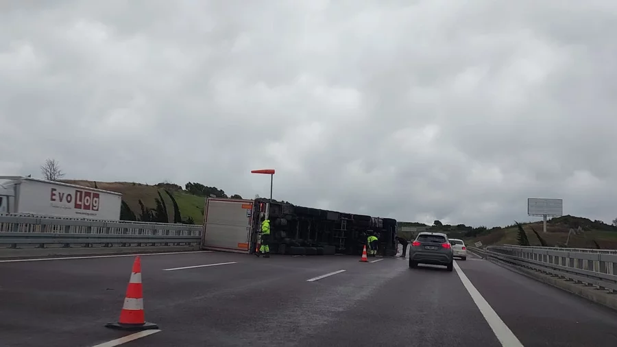 Bursa İstanbul otobanı Orhangazi Gebze arasındaki bir viyadükte tır fırtınanın etkisiyle devrildi.