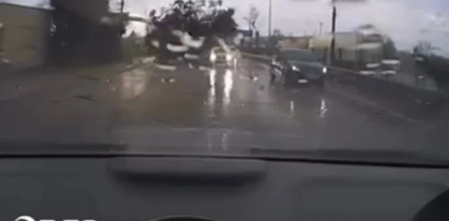 Aracın arka kamerasın yansıyan görüntülerde ana yolda kimsenin bulunmadığı bir sırada fırtınanın etkisiyle bir ağaç yola devrildi.