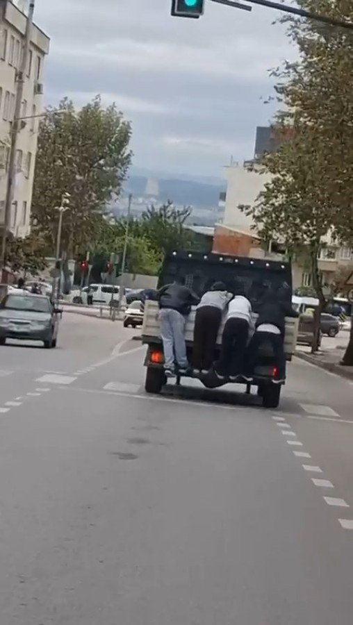 Diğer görüntülerde ise yine otobüsün arkasına tutunan ile kamyonetin kasasına asılarak ilerleyen gençler, 'pes' dedirtti.