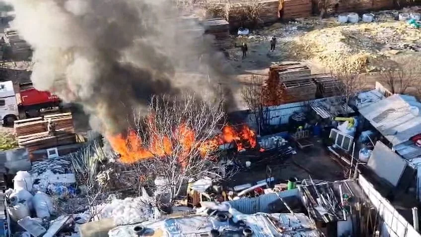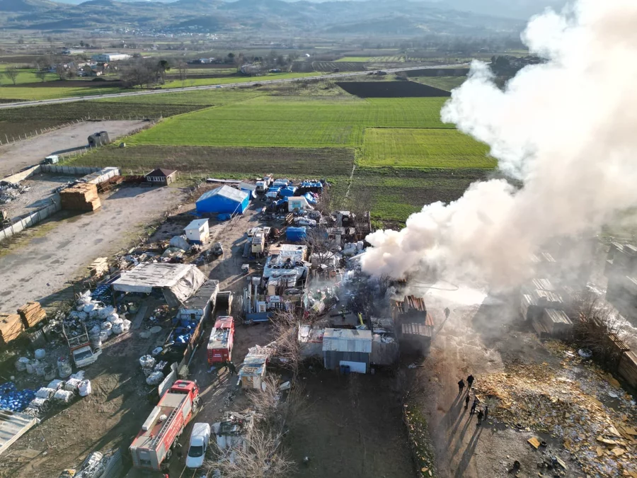BURSA, 09 Ocak 2026 Cuma, 17:10Bursa'nın İnegöl ilçesinde faaliyet gösteren bir geri dönüşüm (hurdacı) tesisinde yangın çıktı. Yangın havadan görüntülendi.