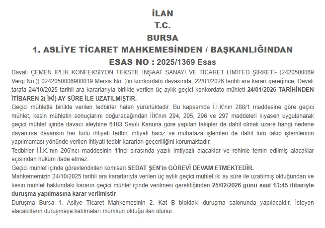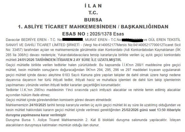 Mahkeme ayrıca Bedriye Eren, Murat Eren ve Gül Eren Tekstil Sanayi ve Dahili Ticaret Ltd. Şti. tarafından açılan konkordato davasında davacılar lehine verilen üç aylık geçici mühletini yine 24 Ocak 2026'dan itibaren iki ay süreyle uzattı. Bu dosyada da konkordato komiserinin görevinin sürdüğü bildirildi.