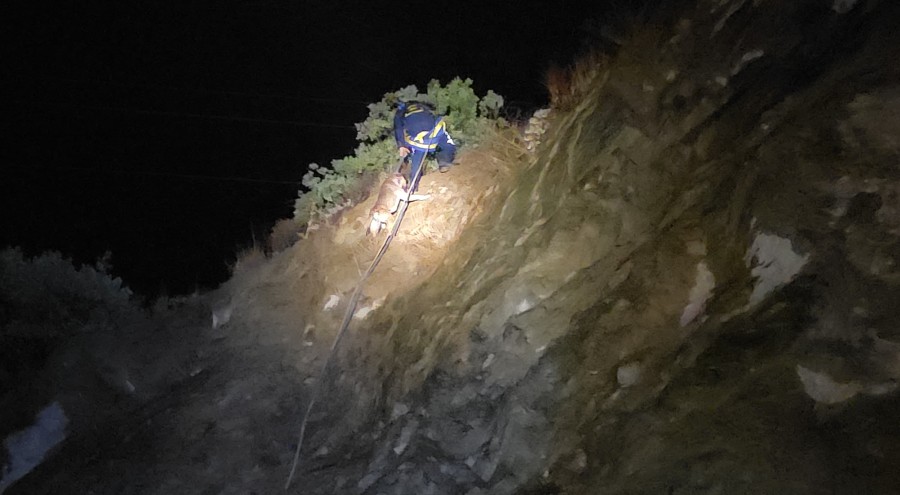 Olay yerine gelen ekipler, yağıştan kayganlaşan kayalığa araçtaki merdivenle güvenli şekilde yaklaşamayınca halatla yamaç inişi yaptı.