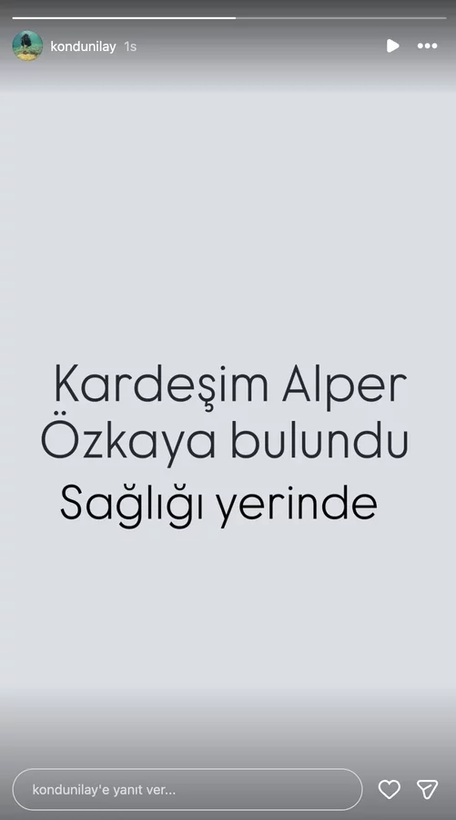 Yapılan çalışmalar neticesinde Alper Özkaya'nın sağ salim bulunduğu bildirildi. Müjdeli haberi, Özkaya'nın ablası Nilay Kondu da sosyal medya hesabından duyurdu.