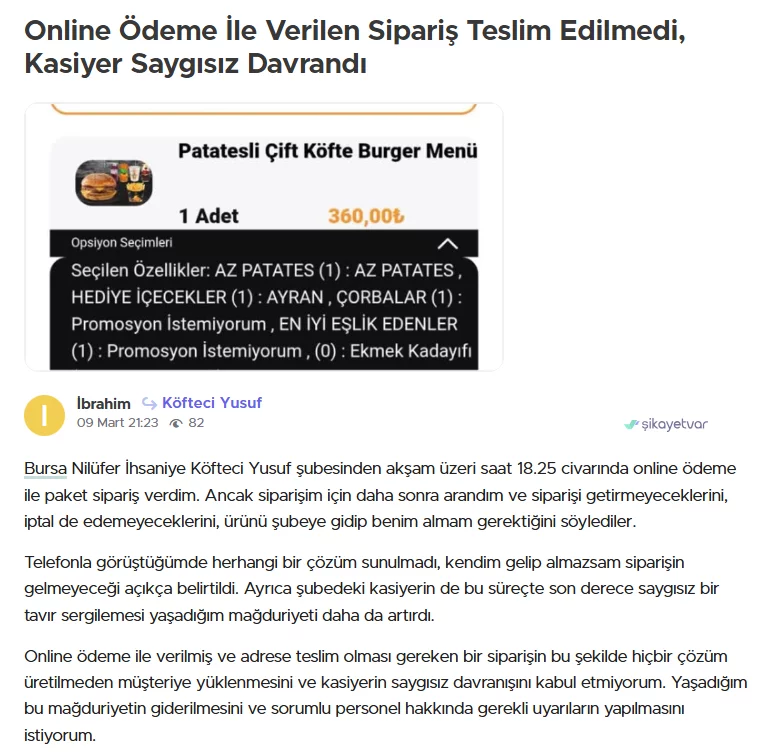 Bursa'da yaşanan olayda tüketici, 9 Mart günü saat 18.25 civarında Köfteci Yusuf şubesinden online ödeme yöntemiyle paket sipariş verdi.