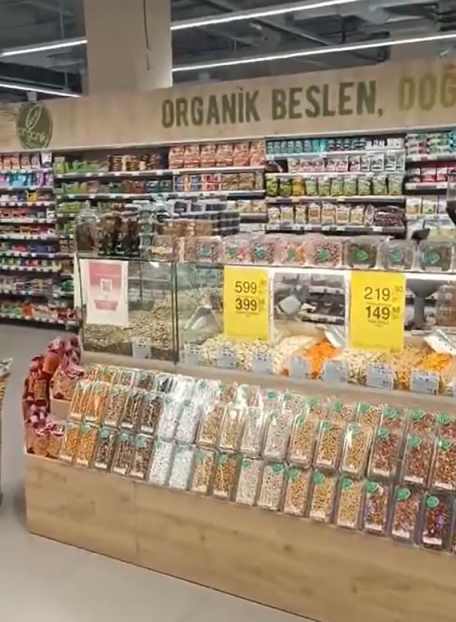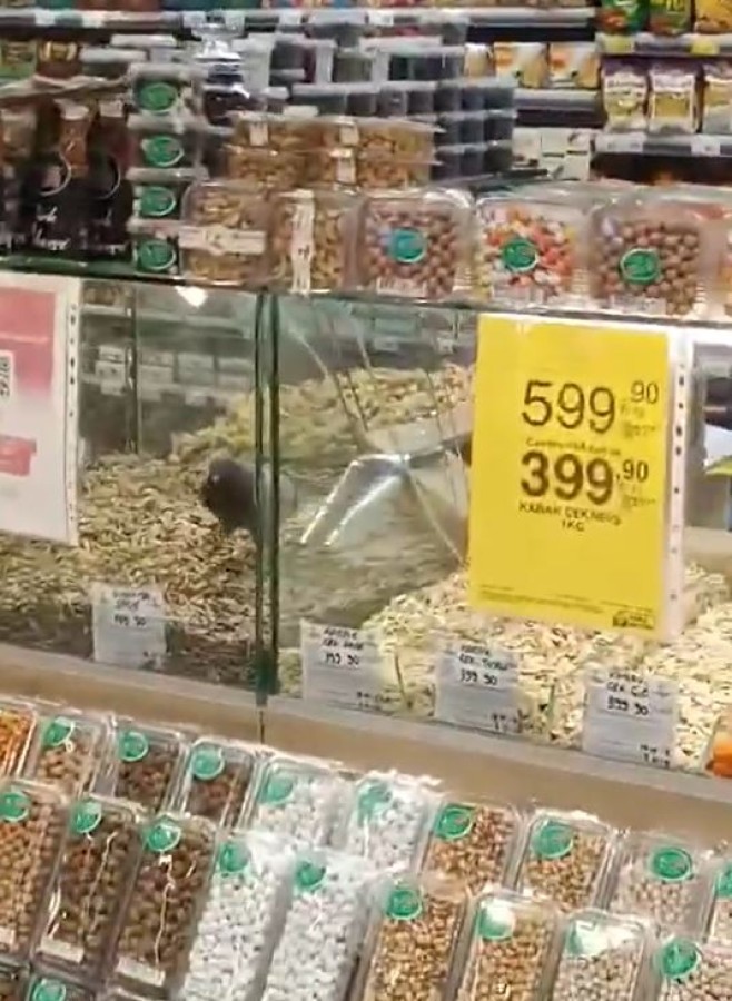 Bursa Nilüfer Ataevler Mahallesi'nde bulunan CarrefourSA şubesinde kuruyemiş reyonunda güvercinlerin gezindiğini kayıt altına alan takipçimiz: