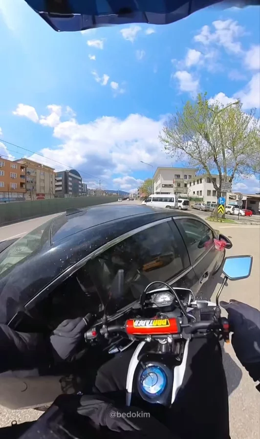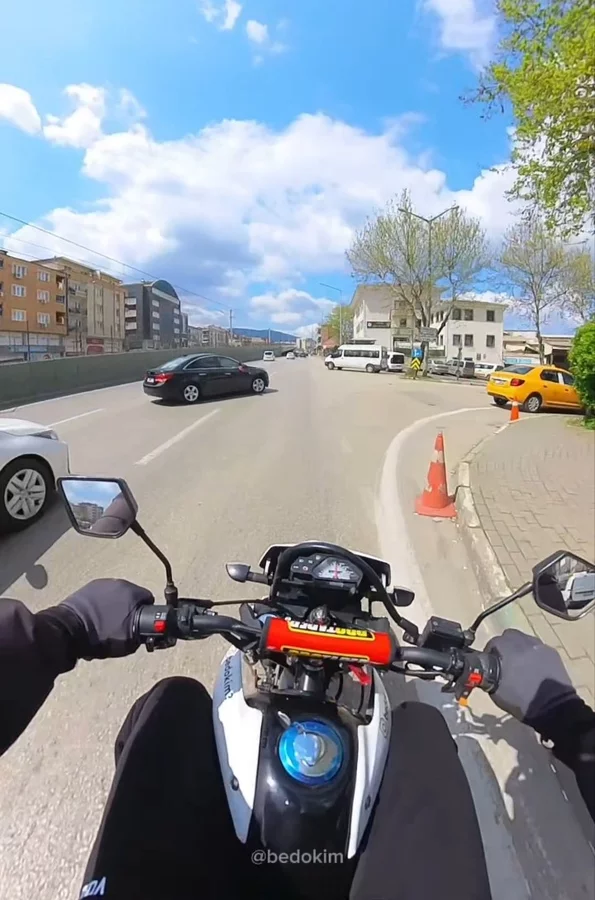 Çarpmanın etkisiyle motosiklet sürücüsü yere yığılırken, yaşananlar kask kamerası tarafından kaydedildi.