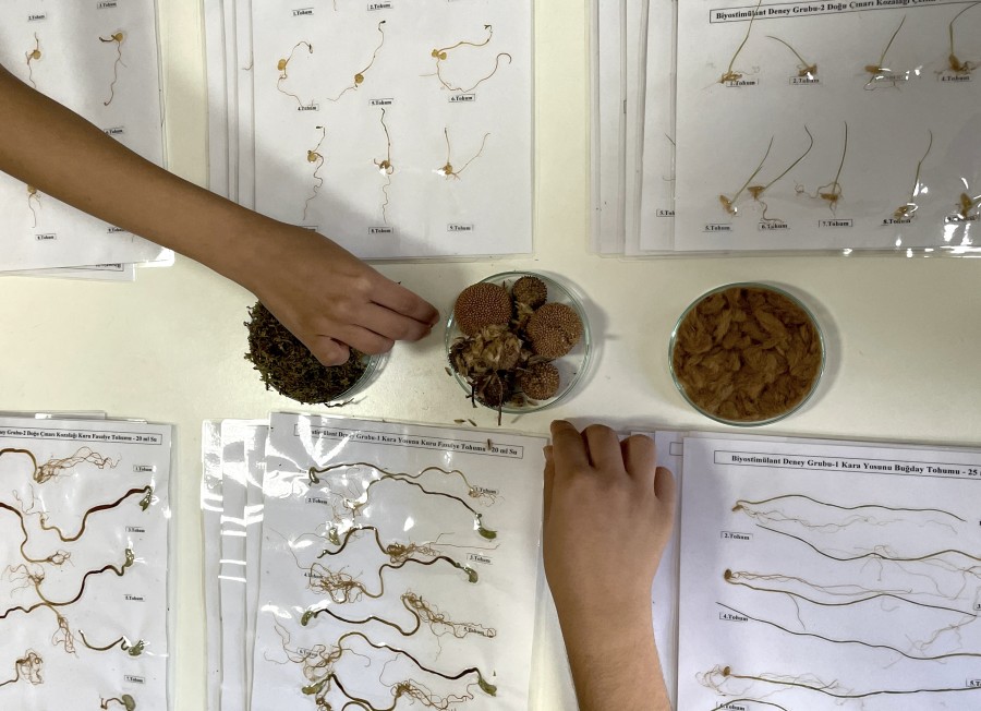 "Su miktarlarımızı 10 mililitreden başlayıp 30 mililitreye kadar arttırdık. Daha sonrasında yeşil mercimek, kuru fasulye, buğday ve çeltik tohumları üzerinde çimlenme deneyi uyguladık. Sonucunda ise bu biyostimülantların çimlenmeyi destekleme ve dormansiyi (bitki ve tohumların olumsuz çevre koşullarında büyüme ve gelişmeyi geçici olarak durdurması) öne çekme oranlarını belirleyerek çeşitli hesaplamalar yaptık. Bu çalışmanın sonunda topraksız tarımda özellikle kara yosununun yeni bir biyostimülant olarak kullanılmasını ve çimlenmeyi destekleyici bir ürün bazında ticarileştirilmesini hedefledik."