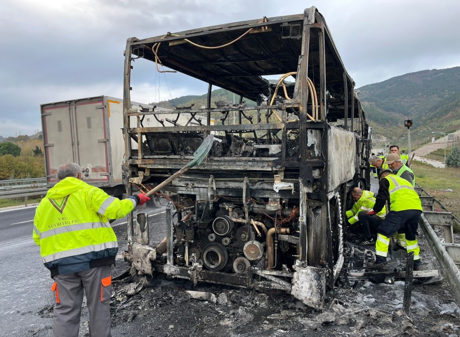 BURSA, 27 Kasım 2025 Perşembe, 10:31Gebze-Orhangazi-İzmir Otoyolu Orhangazi Tüneli yakınlarında meydana gelen otobüs yangınında Çanakkale'nin Lapseki ilçesinden İstanbul'a geziye giden öğrencileri taşıyan otobüs motor bölümünden alev aldı. Sürücünün emniyet şeridine çekip öğrencileri tahliye ettiği olayda otobüs alev topuna döndü. Otobüs itfaiye ekiplerinin müdahalesi ile söndürüldü.