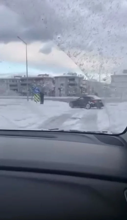Kar yağışını fırsat bilen bir sürücü, otomobiliyle kavşakta drift atarak trafik güvenliğini hiçe saydı.