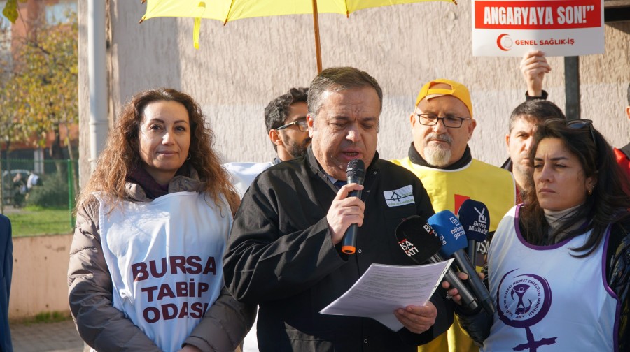 Açıklama; Bursa Tabip Odası (BTO), Genel Sağlık İş Sendikası, HEKİM SEN Bursa Şubesi, Sağlık ve Sosyal Hizmet Emekçileri Sendikası Bursa Şubesi (SES), Bursa Aile Hekimleri Derneği (BURSAHED), Hekim Birliği Sendikası, Sağlık Çalışanları Hak ve Mücadele Derneği (SA-HA DER) ile Birlik ve Dayanışma Sendikası'nın çağrısıyla düzenlendi.