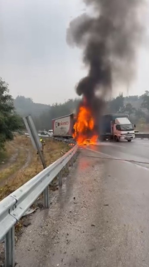Yangın itfaiye ekipleri tarafından söndürülürken, alevlere teslim olan tırın bir kısmı yanarak kullanılamaz hale geldi.