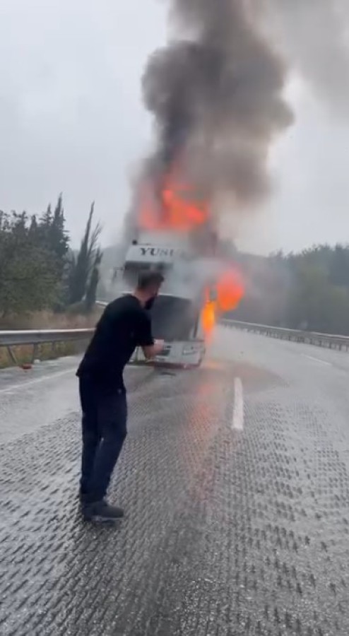 Bursa'dan Yalova yönüne gitmekte olan tırın motor bölümünde henüz bilinmeyen bir nedenle yangın çıktı. Durumu fark eden sürücü aracı kenara çekti ve ilk olarak alevlere kendi imkanları ile müdahale etmek istedi.
