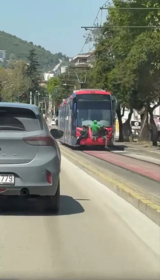 Hareket halindeki tramvayın arkasına tutunan çocuklar metrelerce bu şekilde ilerledi.