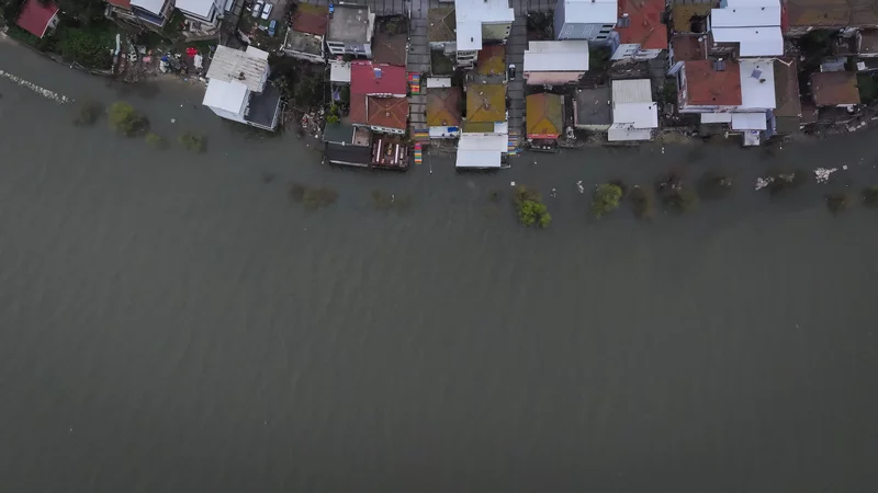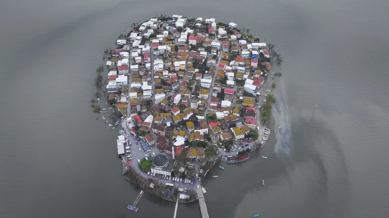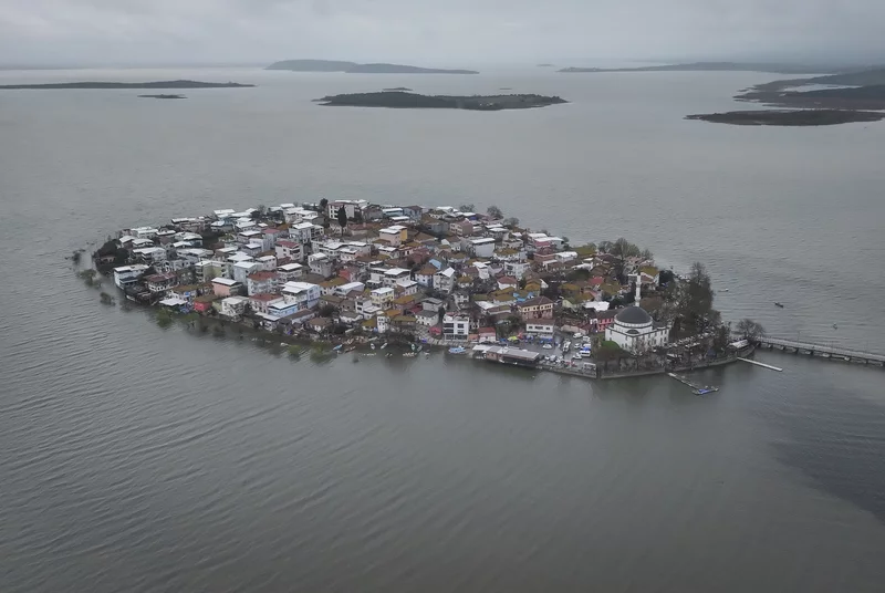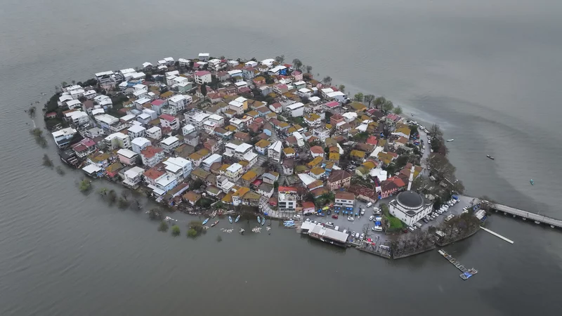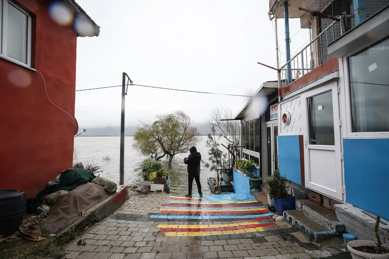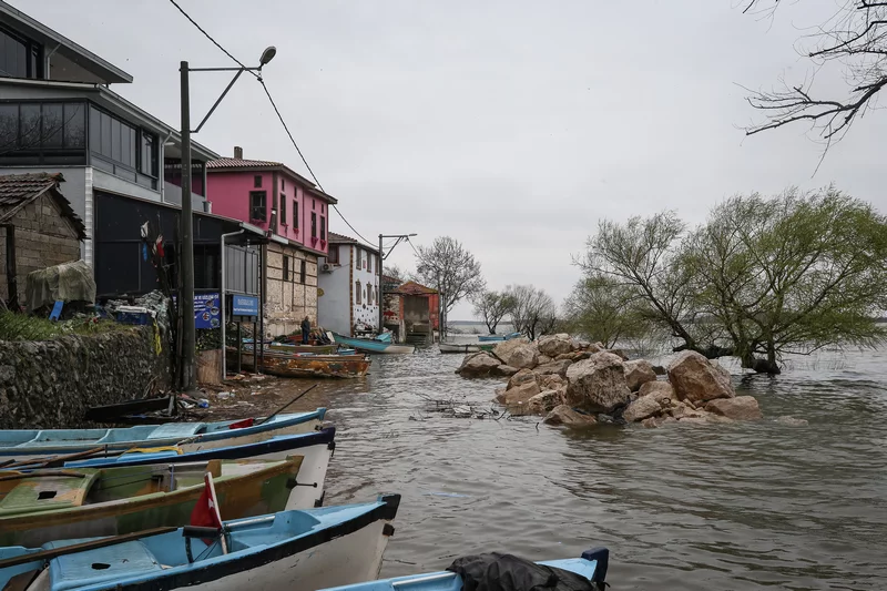 Gölyazı'nın kıyı şeridindeki araç ve yaya yolu tamamen su altında kaldı, göl suyu bazı ev ve iş yerlerinin duvarlarına dayandı.