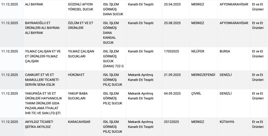 Bursa özelinde yapılan denetimlerde ise Nilüfer ilçesinde faaliyet gösteren Yılmaz Çalışan Sucukları markasına ait 722 gramlık ısıl işlem görmüş dana sucukta uygunsuzluk tespit edildi.