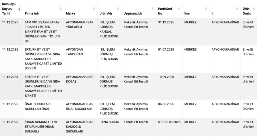 BURSA, 12 Aralık 2025 Cuma, 09:325996 Sayılı Veteriner Hizmetleri, Bitki Sağlığı, Gıda ve Yem Kanunu'nun 31'inci maddesi kapsamında, taklit ve tağşiş yaptığı belirlenen ürünlerin kamuoyuyla paylaşılabileceği hükmü doğrultusunda yayımlanan listede, bazı sucuklarda "mekanik ayrılmış kanatlı eti" ve "sakatat" gibi mevzuata aykırı içeriklere rastlandığı belirtildi.