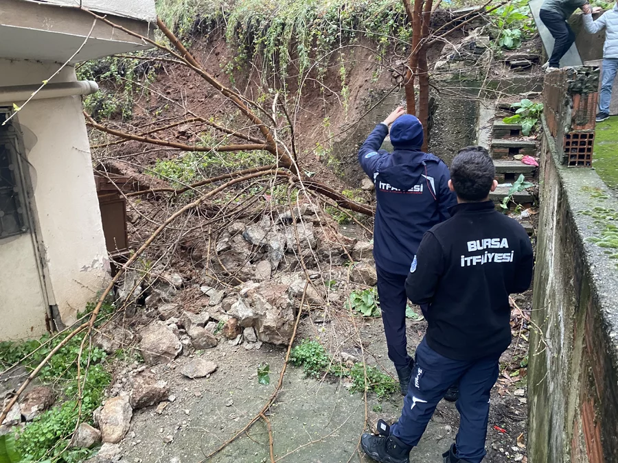 BURSA, 30 Mart 2026 Pazartesi, 19:18Olay, Osmangazi ilçesi Kükürtlü Mahallesi Emir Abdulkadir Caddesi üzerinde meydana geldi. Edinilen bilgilere göre, günlerdir aralıksız devam eden yağışlar nedeniyle zeminin yumuşaması sonucu istinat duvarı çöktü. Çökme sırasında bahçede bulunan ağaçlar da kökünden sökülerek binaya doğru devrildi.