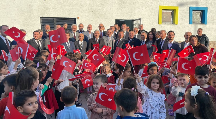 Gemlik'te inşa edilen 8 derslik, yemekhane, çalışma salonları ve oyun alanlarının bulunduğu anaokulunun açılış törenine katılan Hisarcıklıoğlu, açılış kurdelesini öğrencilerle kesti.