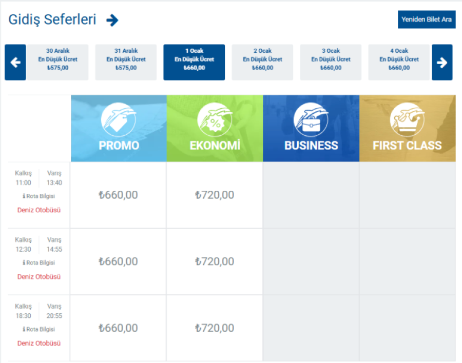 Zam sonrası promosyon bilet fiyatları 575 TL'den 660 TL'ye yükselirken, ekonomi sınıfı biletler de 630 TL'den 720 TL'ye çıktı.