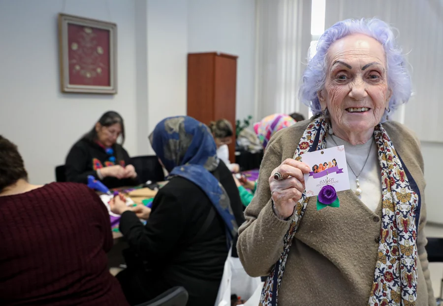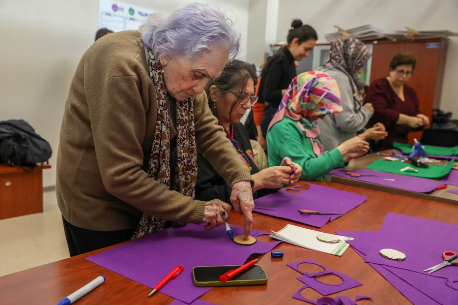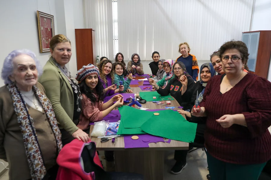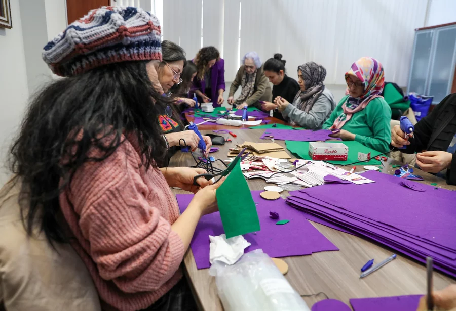 BURSA, 03 Mart 2026 Salı, 16:29Bursa Kent Konseyi Kadın Meclisi'nde gerçekleştirilen atölye çalışmasında, keçe kumaşlar, renkli iplikler, düğmeler ve süsleme malzemeleri kullanılarak birbirinden renkli ürünler hazırlandı. Kadınların dayanışma ve ortak üretim gücünü bir kez daha ortaya koyan ürünler, 8 Mart Pazar günü yapılacak yürüyüşte kullanılacak.